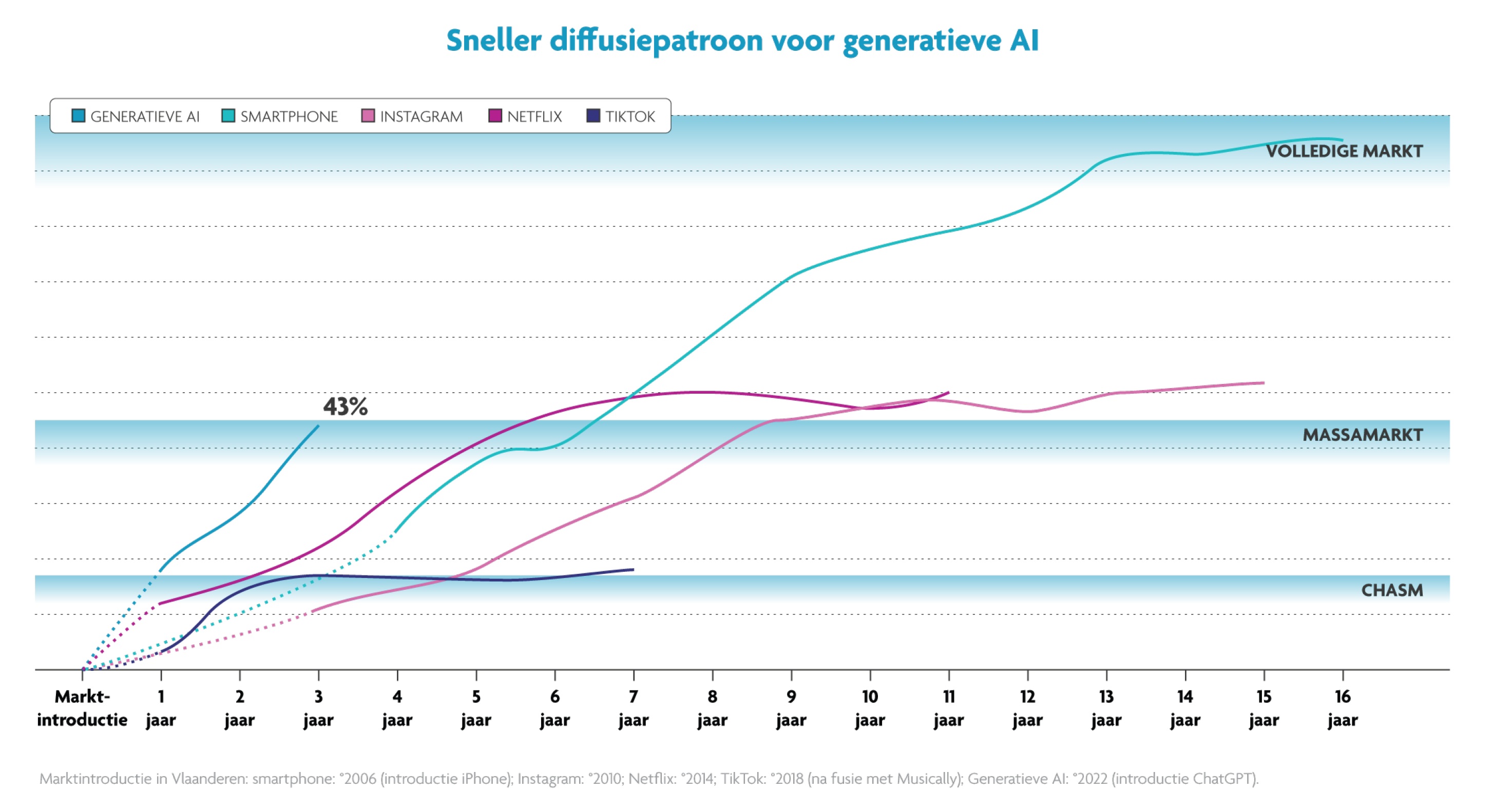 « Nous pouvons affirmer que l’IA générative est définitivement devenue un phénomène de masse en Flandre », déclare l’imec. Cela ressort également du schéma de diffusion de l’IA générative. La théorie de la diffusion stipule qu’il existe deux points critiques. Le premier point se situe autour de 13-17 %, lorsque la technologie a atteint les innovateurs et les adoptants précoces. À partir de 40 – 45 %, nous atteignons le point où la technologie est définitivement ancrée dans le marché de masse.